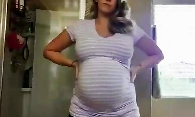 A hot housewife in the kitchen flirts merrily showing her attractive backside and not young natural movable bra-stuffers that drape a